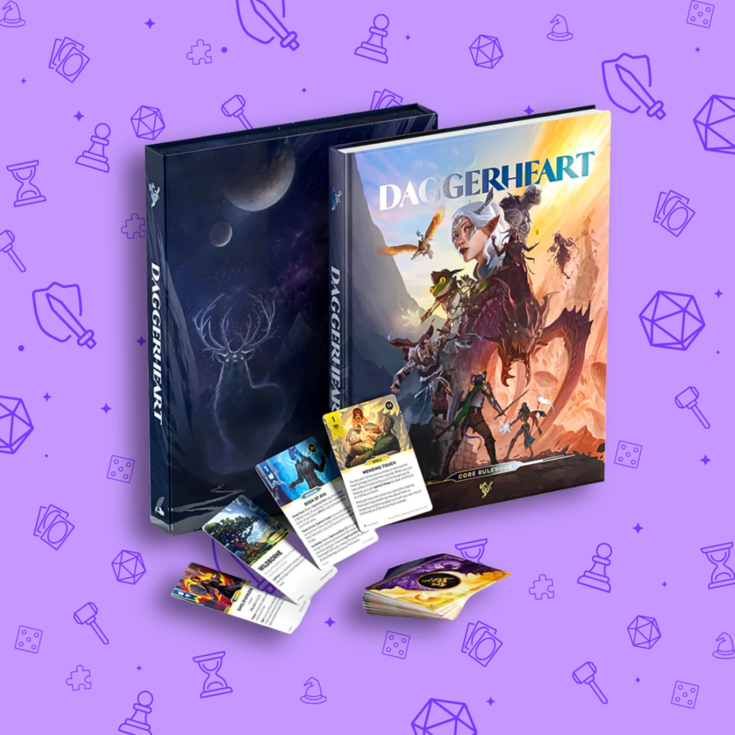 Daggerheart is a tabletop roleplaying game of epic and heartfelt tales of adventure, tuned uniquely by your group for maximum fun at YOUR table. A perfect companion to storytellers of all kinds, the Daggerheart Core Set contains a nearly 300 page hardcover rulebook and a box containing 279 art-filled cards for rich character customization.