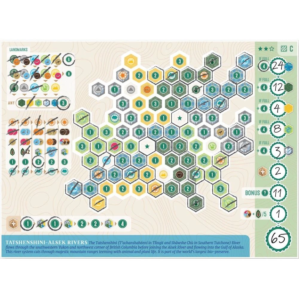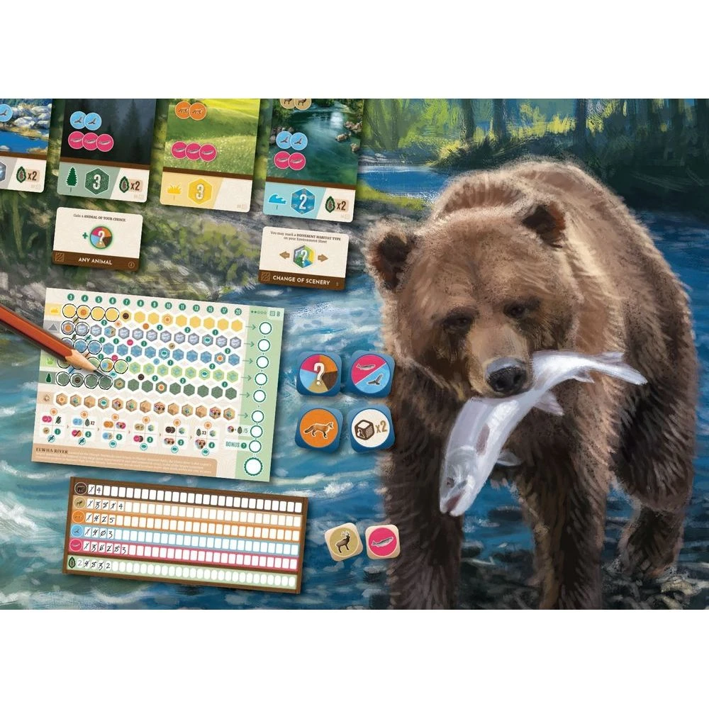 Roll your dice, collect wildlife and Nature Tokens, complete Habitat Cards, and fill in the puzzle on your personal Environment Sheet to create the most harmonious ecosystem in Cascadia! Although the core rules are simple, each unique Environment Sheet has its own twist so no two games of Cascadia: Rolling will play out the same!