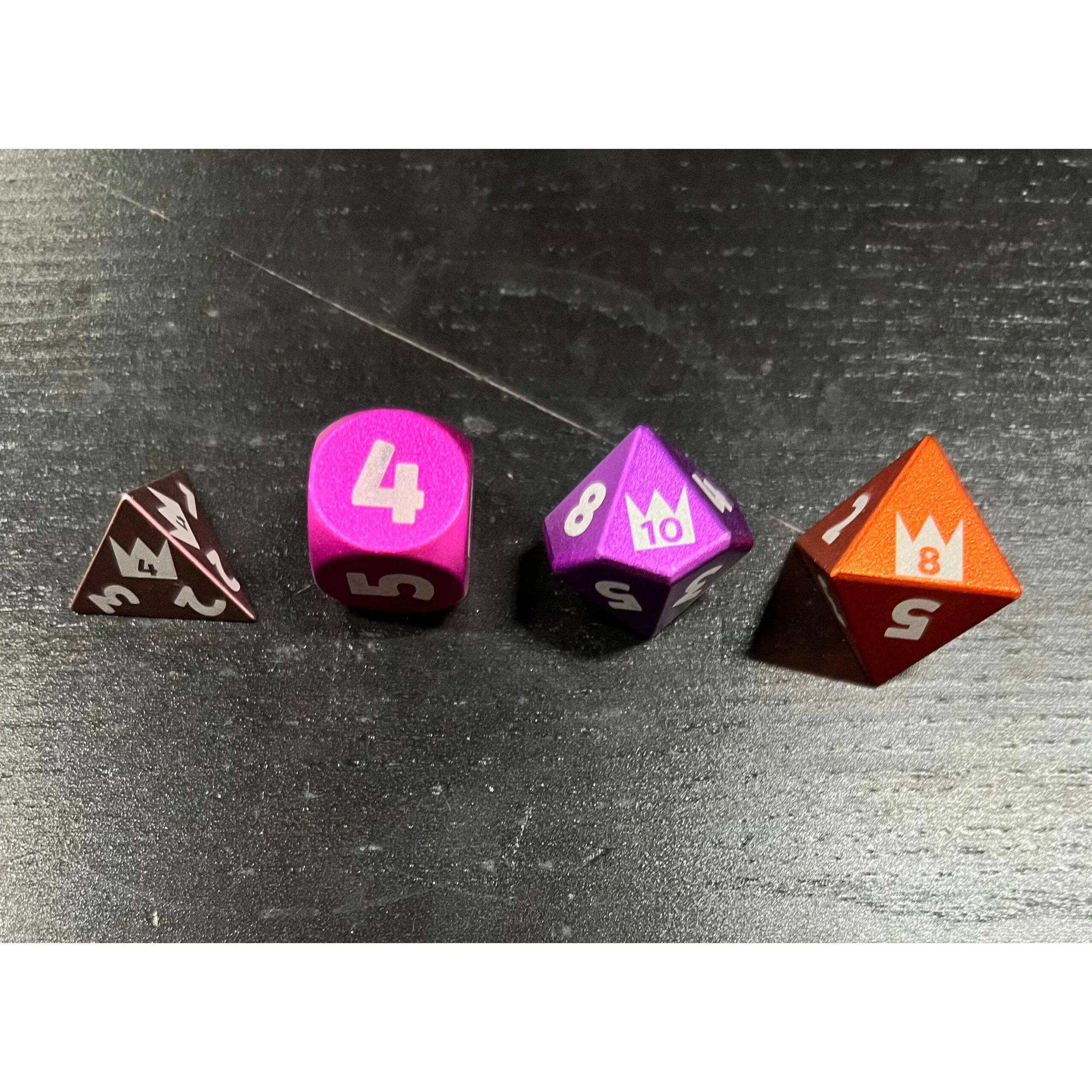 A full set of 25mm metal dice for playing The Excellents. You receive one d4, d6, d8 and d10! Each die features unique Excellents iconography, including a paw on the 1 (for your beast friend) and a crown on the top number (for your crown, of course!)