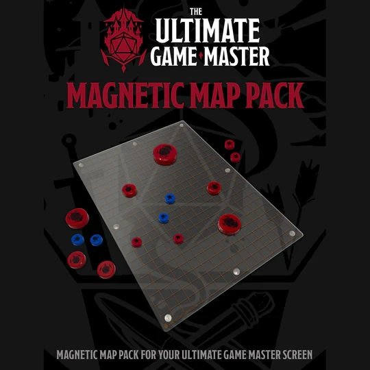 Track your character and monster movement using the Magnetic Map Pack! Use this pack to draw your own maps on the panel using wet/dry erase markers OR use the magnetic grid panel to affix printed maps behind it to the screen OR perhaps a bit of both! Tokens are also Wet/Dry Erase friendly so you can write the number from the initiative order ON the token. The whole system will affix to the Ultimate Game Master Screen magnetically!